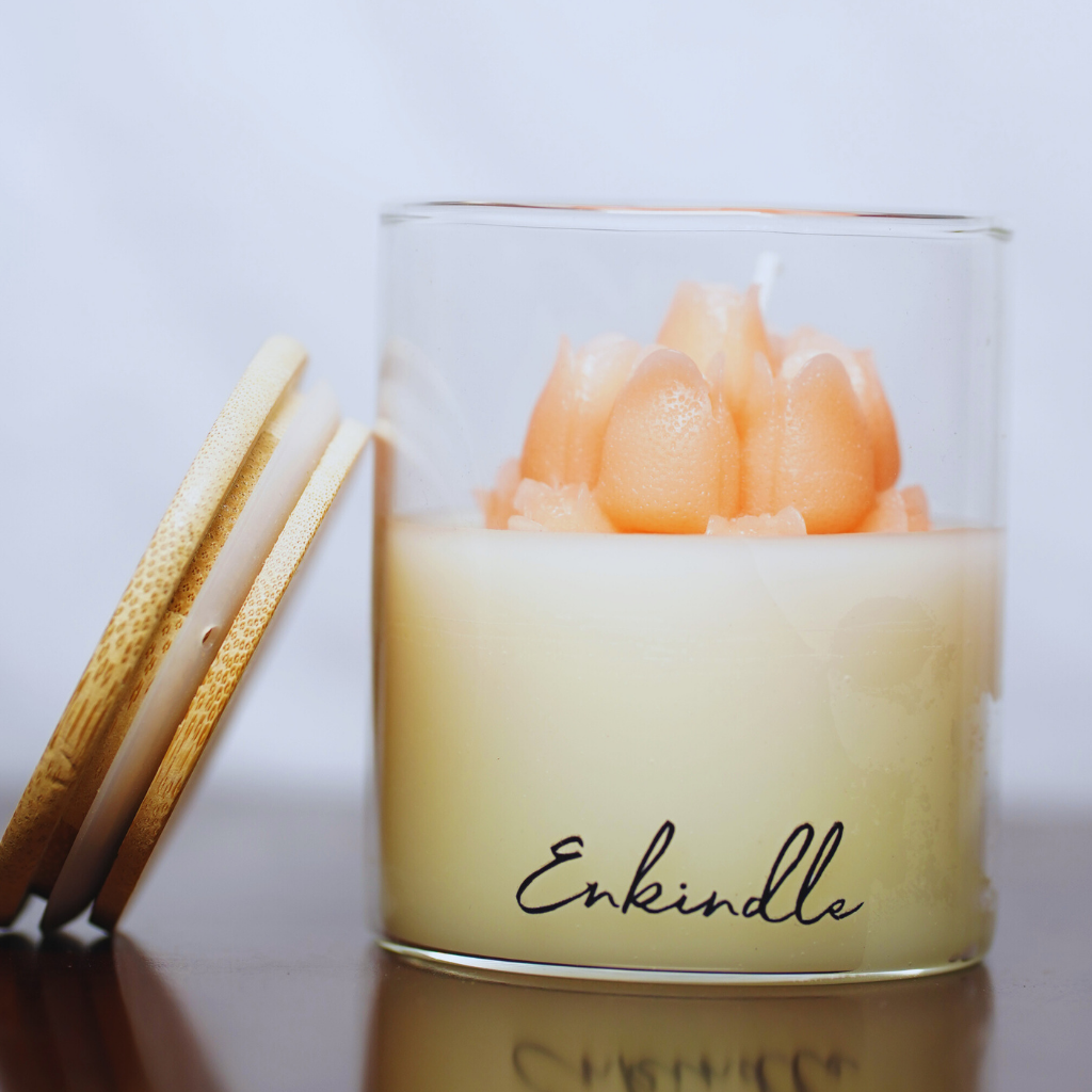 At its heart lies a carefully molded bloom-like wax, shaped to reflect the softness of real petals. The minimalist vessel ensures that every detail of this artistry stands out, transforming a simple corner into a point of inspiration. Whether resting on your dining table, dresser, or display shelf, it enhances the mood of your space with subtle sophistication.